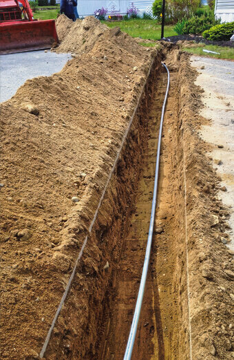 Compliant trenching services and installation of electrical-grade conduit for mains cabling, including proper backfill, warning tape, and compaction.